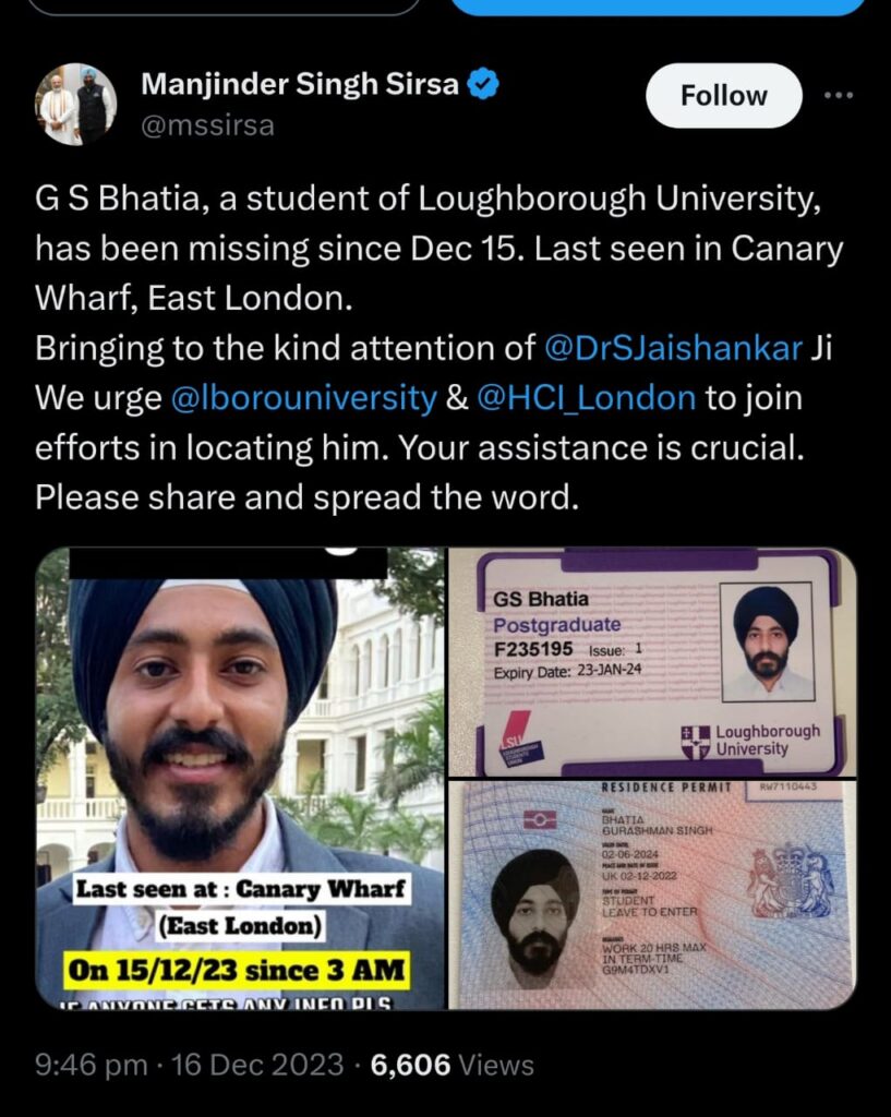 ਜਲੰਧਰ ਦਾ ਰਹਿਣ ਵਾਲਾ ਇਕ ਨੌਜਵਾਨ ਲੰਡਨ ਵਿੱਚ ਲਾਪਤਾ ਹੋ ਗਿਆ ਹੈ। ਲਾਪਤਾ ਨੌਜਵਾਨ ਦੀ ਪਹਿਚਾਣ ਗੁਰਸ਼ਮਨ ਸਿੰਘ ਭਾਟੀਆ (23) ਵਾਸੀ ਮਾਡਲ ਟਾਊਨ ਜਲੰਧਰ ਵਜੋ ਹੋਈ ਹੈ। ਗੁਰਸ਼ਮਨ ਸਿੰਘ ਪੂਰਬੀ ਲੰਡਨ ਵਿੱਚ ਪੜ੍ਹਾਈ ਕਰਨ ਲਈ ਗਿਆ ਹੈ। ਜਿਸ ਨੂੰ ਆਖਰੀ ਵਾਰ ਪੂਰਬੀ ਲੰਡਨ ਦੇ ਕੈਨਰੀ ਵਾਰਫ ਵਿਖੇ ਦੇਖਿਆ ਗਿਆ। ਭਾਜਪਾ ਆਗੂ ਮਨਜਿੰਦਰ ਸਿੰਘ ਸਿਰਸਾ ਨੇ 15 ਦਸੰਬਰ ਤੋਂ ਲਾਪਤਾ ਗੁਰਸ਼ਮਨ ਸਿੰਘ ਭਾਟੀਆ ਬਾਰੇ ਜਾਣਕਾਰੀ ਸੋਸ਼ਲ ਮੀਡੀਆ ਤੇ ਸਾਂਝੀ ਕਰਦਿਆਂ ਵਿਦੇਸ਼ ਮੰਤਰੀ ਤੋਂ ਮਦਦ ਦੀ ਮੰਗ ਕੀਤੀ ਗਈ ਹੈ।