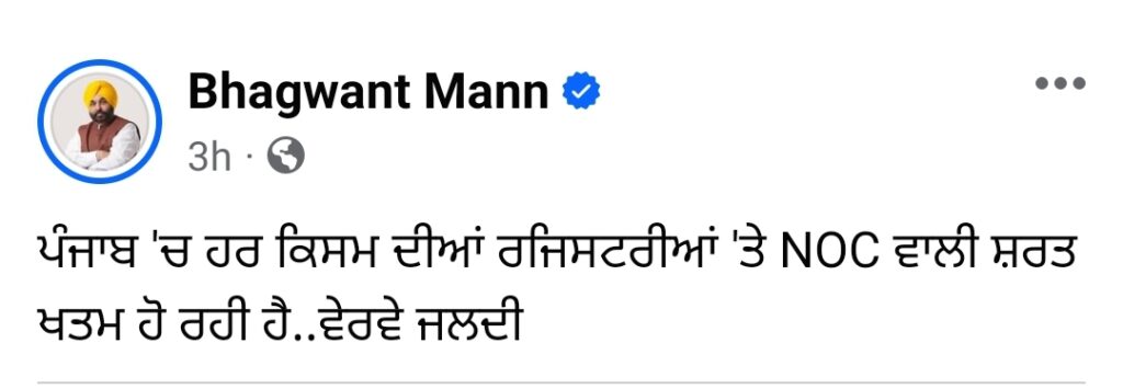 ਮੁੱਖ ਮੰਤਰੀ ਭਗਵੰਤ ਮਾਨ ਨੇ ਟਵੀਟ ਕਰਕੇ ਕਿਹਾ….ਪੰਜਾਬ ਵਿੱਚ ਹਰ ਕਿਸਮ ਦੀਆਂ ਰਜਿਸਟਰੀਆਂ ‘ਤੇ NOC ਵਾਲੀ ਸ਼ਰਤ ਖਤਮ ਹੋ ਰਹੀ ਹੈ..ਵੇਰਵੇ ਜਲਦੀ…..