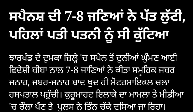 ਝਾਰਖੰਡ ਦੇ ਦੁਮਕਾ ਜ਼ਿਲ੍ਹੇ ‘ਚ ਸਪੇਨ ਤੋਂ ਦੁਨੀਆਂ ਘੁੰਮਣ ਆਈ ਵਿਦੇਸ਼ੀ ਬੀਬਾ ਨਾਲ 7-8 ਜਾਣਿਆਂ ਨੇ ਕੀਤਾ ਸਮੂਹਿਕ ਜਬਰ ਜਨਾਹ, ਜਬਰ-ਜਨਾਹ ਬਾਦ ਖੁਦ ਹੀ ਮੋਟਰਸਾਇਕਲ ਚਲਾ ਹਸਪਤਾਲ ਪਹੁੰਚੀ। ਕੁਰੂਮਾਹਟ ਇਲਾਕੇ ਦਾ ਮਾਮਲਾ ਤੇ ਮੀਡੀਆ ‘ਚ ਰੌਲਾ ਪੈਂਣ ਤੇ ਪੁਲਸ ਨੇ ਤਿੰਨ ਚੱਕੇ ਦਸਿਆ ਜਾ ਰਿਹਾ।