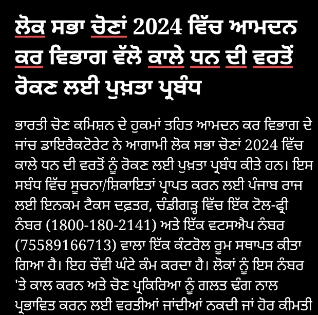 ਭਾਰਤੀ ਚੋਣ ਕਮਿਸ਼ਨ ਦੇ ਹੁਕਮਾਂ ਤਹਿਤ ਆਮਦਨ ਕਰ ਵਿਭਾਗ ਦੇ ਜਾਂਚ ਡਾਇਰੈਕਟੋਰੇਟ ਨੇ ਆਗਾਮੀ ਲੋਕ ਸਭਾ ਚੋਣਾਂ 2024 ਵਿੱਚ ਕਾਲੇ ਧਨ ਦੀ ਵਰਤੋਂ ਨੂੰ ਰੋਕਣ ਲਈ ਪੁਖ਼ਤਾ ਪ੍ਰਬੰਧ ਕੀਤੇ ਹਨ। ਇਸ ਸਬੰਧ ਵਿੱਚ ਸੂਚਨਾ/ਸ਼ਿਕਾਇਤਾਂ ਪ੍ਰਾਪਤ ਕਰਨ ਲਈ ਪੰਜਾਬ ਰਾਜ ਲਈ ਇਨਕਮ ਟੈਕਸ ਦਫ਼ਤਰ, ਚੰਡੀਗੜ੍ਹ ਵਿੱਚ ਇੱਕ ਟੋਲ-ਫ੍ਰੀ ਨੰਬਰ (1800-180-2141) ਅਤੇ ਇੱਕ ਵਟਸਐਪ ਨੰਬਰ (75589166713) ਵਾਲਾ ਇੱਕ ਕੰਟਰੋਲ ਰੂਮ ਸਥਾਪਤ ਕੀਤਾ ਗਿਆ ਹੈ। ਇਹ ਚੌਵੀ ਘੰਟੇ ਕੰਮ ਕਰਦਾ ਹੈ। ਲੋਕਾਂ ਨੂੰ ਇਸ ਨੰਬਰ ‘ਤੇ ਕਾਲ ਕਰਨ ਅਤੇ ਚੋਣ ਪ੍ਰਕਿਰਿਆ ਨੂੰ ਗਲਤ ਢੰਗ ਨਾਲ ਪ੍ਰਭਾਵਿਤ ਕਰਨ ਲਈ ਵਰਤੀਆਂ ਜਾਂਦੀਆਂ ਨਕਦੀ ਜਾਂ ਹੋਰ ਕੀਮਤੀ ਵਸਤੂਆਂ ਨਾਲ ਸਬੰਧਤ ਵਿਸ਼ੇਸ਼ ਜਾਣਕਾਰੀ ਦੇਣ ਲਈ ਉਤਸ਼ਾਹਿਤ ਕੀਤਾ ਜਾਂਦਾ ਹੈ। ਕਾਲ ਕਰਨ ਵਾਲਿਆਂ ਦੀ ਪਛਾਣ ਗੁਪਤ ਰੱਖੀ ਜਾਵੇਗੀ। ਕਿਸੇ ਜ਼ਿਲ੍ਹੇ ਨਾਲ ਸਬੰਧਤ ਸ਼ਿਕਾਇਤਾਂ ਤੇ ਕਾਰਵਾਈ ਕਰਨ ਲਈ ਹਰੇਕ ਜ਼ਿਲ੍ਹੇ ਵਿੱਚ ਅਧਿਕਾਰੀਆਂ ਅਤੇ ਇੰਸਪੈਕਟਰਾਂ ਦੀਆਂ ਟੀਮਾਂ ਤਾਇਨਾਤ ਕੀਤੀਆਂ ਗਈਆਂ ਹਨ। ਸੂਚਨਾ ਦੀ ਪ੍ਰਮਾਣਿਕਤਾ ਦੇ ਆਧਾਰ ‘ਤੇ ਅਤੇ ਜਾਂਚ ਤੋਂ ਬਾਅਦ ਉਚਿਤ ਮਾਮਲਿਆਂ ‘ਚ ਕਾਨੂੰਨ ਅਨੁਸਾਰ ਨਕਦੀ ਆਦਿ ਜ਼ਬਤ ਕਰਨ ਦੀ ਕਾਰਵਾਈ ਕੀਤੀ ਜਾਵੇਗੀ। ਇਸ ਵਿਸ਼ੇਸ਼ ਮਕਸਦ ਲਈ 100 ਦੇ ਕਰੀਬ ਅਧਿਕਾਰੀ ਅਤੇ ਇੰਸਪੈਕਟਰ ਤਾਇਨਾਤ ਕੀਤੇ ਗਏ ਹਨ। ਇਹ ਟੀਮਾਂ ਜ਼ਿਲ੍ਹਾ ਚੋਣ ਅਫ਼ਸਰ (ਡੀ.ਈ.ਓ.) ਦੇ ਜ਼ਿਲ੍ਹਾ ਕੰਟਰੋਲ ਰੂਮ ਦੇ ਨਾਲ-ਨਾਲ ਜ਼ਿਲ੍ਹਾ ਪੱਧਰ ‘ਤੇ ਹੋਰ ਏਜੰਸੀਆਂ ਨਾਲ ਨਜ਼ਦੀਕੀ ਤਾਲਮੇਲ ਵਿੱਚ ਕੰਮ ਕਰਨਗੀਆਂ। ਚੋਣ ਪ੍ਰਕਿਰਿਆ ਦੌਰਾਨ ਬੇਹਿਸਾਬ ਨਕਦੀ ਦੇ ਪ੍ਰਬੰਧਨ ਵਿੱਚ ਸੰਭਾਵਿਤ ਤੌਰ ‘ਤੇ ਸ਼ਾਮਲ ਵਿਅਕਤੀਆਂ, ਸਥਾਨਾਂ ਅਤੇ ਗਤੀਵਿਧੀਆਂ ‘ਤੇ ਸਖ਼ਤ ਨਜ਼ਰ ਰੱਖੀ ਜਾ ਰਹੀ ਹੈ। ਏਅਰ ਇੰਟੈਲੀਜੈਂਸ ਯੂਨਿਟ (AIU) ਪੰਜਾਬ ਰਾਜ ਦੇ ਸਾਰੇ ਹਵਾਈ ਅੱਡਿਆਂ ਦੇ ਨਾਲ-ਨਾਲ ਰਾਜ ਲਈ ਵਪਾਰਕ ਉਡਾਣਾਂ ਦੀ ਸੇਵਾ ਕਰਨ ਵਾਲੇ ਹਵਾਈ ਅੱਡਿਆਂ ‘ਤੇ ਕਾਰਜਸ਼ੀਲ ਹੈ। ਇਹ ਯੂਨਿਟ ਹਵਾਈ ਰਾਹੀਂ ਨਕਦੀ ਦੀ ਆਵਾਜਾਈ ‘ਤੇ ਤਿੱਖੀ ਨਜ਼ਰ ਰੱਖ ਰਹੇ ਹਨ। ਇਸੇ ਤਰ੍ਹਾਂ ਰੇਲਵੇ ਰਾਹੀਂ ਨਕਦੀ ਆਦਿ ਦੀ ਆਵਾਜਾਈ ‘ਤੇ ਵੀ ਰੇਲਵੇ ਅਧਿਕਾਰੀਆਂ ਨਾਲ ਤਾਲਮੇਲ ਕਰਕੇ ਨਿਗਰਾਨੀ ਰੱਖੀ ਜਾ ਰਹੀ ਹੈ। ਬੈਂਕ ਖਾਤਿਆਂ ਤੋਂ ਇੱਕ ਨਿਸ਼ਚਿਤ ਸੀਮਾ ਤੋਂ ਵੱਧ ਨਕਦੀ ਕਢਵਾਉਣ ਨਾਲ ਸਬੰਧਤ ਜਾਣਕਾਰੀ ਪ੍ਰਾਪਤ ਕੀਤੀ ਜਾ ਰਹੀ ਹੈ ਅਤੇ ਸ਼ੱਕੀ ਲੈਣ-ਦੇਣ ਦੀ ਪਛਾਣ ਕਰਨ ਅਤੇ ਉਚਿਤ ਕਾਰਵਾਈ ਕਰਨ ਲਈ ਕਾਰਵਾਈ ਕੀਤੀ ਜਾ ਰਹੀ ਹੈ। ਡਾਇਰੈਕਟੋਰੇਟ ਉਮੀਦਵਾਰਾਂ ਦੀਆਂ ਜਾਇਦਾਦਾਂ ਅਤੇ ਦੇਣਦਾਰੀਆਂ ਨੂੰ ਘੋਸ਼ਿਤ ਕਰਨ ਵਾਲੇ ਹਲਫ਼ਨਾਮਿਆਂ ਦੀ ਵੀ ਜਾਂਚ ਕਰੇਗਾ ਅਤੇ ਜੇਕਰ ਇਸ ਨਾਲ ਸਬੰਧਤ ਕੋਈ ਵੀ ਜਾਣਕਾਰੀ ਛੁਪਾਈ ਹੋਈ ਹੈ, ਤਾਂ ਉਸ ਦੀ ਸੂਚਨਾ ਚੋਣ ਕਮਿਸ਼ਨ ਨੂੰ ਦਿੱਤੀ ਜਾਵੇਗੀ। ਇਸੇ ਤਰ੍ਹਾਂ ਜੇਕਰ ਉਮੀਦਵਾਰਾਂ ਵੱਲੋਂ ਚੋਣ ਖਰਚੇ ਸਬੰਧੀ ਕੋਈ ਇਤਰਾਜ਼ਯੋਗ ਜਾਣਕਾਰੀ ਇਕੱਠੀ ਕੀਤੀ ਜਾਂਦੀ ਹੈ ਤਾਂ ਉਸ ਦੀ ਸੂਚਨਾ ਚੋਣ ਕਮਿਸ਼ਨ ਨੂੰ ਵੀ ਦਿੱਤੀ ਜਾਵੇਗੀ ।