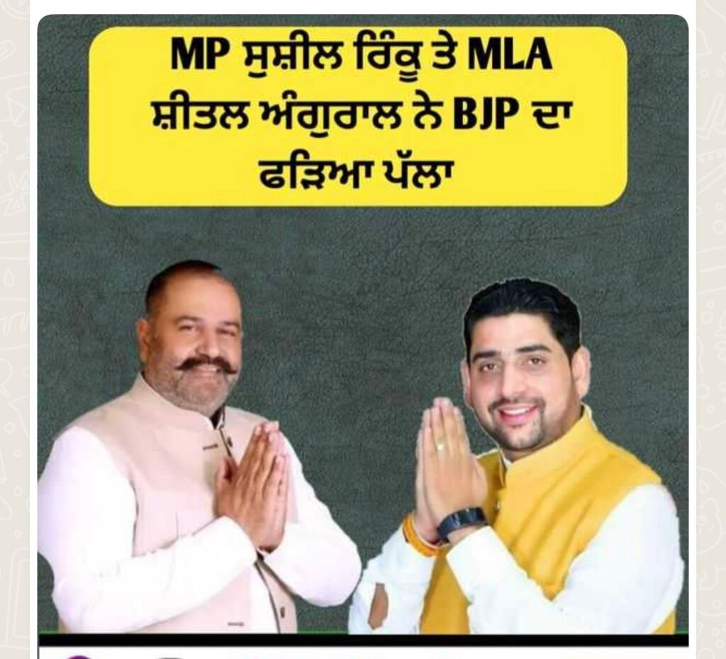ਜਲੰਧਰ ਤੋਂ ਐਮ ਪੀ ਸ਼ੁਸ਼ੀਲ ਕੁਮਾਰ ਰਿੰਕੂ ਅਤੇ ਵਿਧਾਇਕ ਸ਼ੀਤਲ ਅੰਗੂਰਾਲ ਦੇ ਬੀਜੇਪੀ ਵਿੱਚ ਜਾਣ ਦੇ ਪਹਿਲਾਂ ਵੀ ਚਰਚੇ ਸਨ ਤੇ ਅੱਜ ਸਵੇਰ ਤੋਂ ਸ਼ੋਸ਼ਲ ਮੀਡੀਏ ਤੇ ਚਰਚਾ ਸੀ ਜਿਸ ਨੂੰ ਸ਼ੀਤਲ ਅੰਗੂਰਾਲ ਨੇ ਪੋਸਟ ਪਾ ਕੇ ਸੱਚ ਸਾਬਤ ਕਰ ਦਿੱਤਾ ਹੈ। ਜਦੋਂ ਕਿ ਜਲੰਧਰ ਤੋਂ ਆਮ ਆਦਮੀ ਪਾਰਟੀ ਵੱਲੋ ਲੋਕ ਸਭਾ ਲਈ ਉਮੀਦਵਾਰ ਐਲਾਨੇ ਸ਼ੁਸ਼ੀਲ ਕੁਮਾਰ ਰਿੰਕੂ ਬਾਰੇ ਕੋਈ ਖ਼ਬਰ ਨਹੀ ਆਈ।