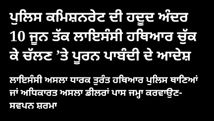 ਹੁਕਮ ਵਿੱਚ ਇਹ ਵੀ ਕਿਹਾ ਗਿਆ ਹੈ ਕਿ ਪੁਲਿਸ ਕਮਿਸ਼ਨਰੇਟ ਜਲੰਧਰ ਦੀ ਹਦੂਦ ਅੰਦਰ ਆਉਂਦੇ ਅਸਲਾ ਲਾਇਸੰਸ ਧਾਰਕਾਂ ਨੂੰ ਆਪਣੇ ਹਰ ਕਿਸਮ ਦੇ ਲਾਇਸੰਸੀ ਹਥਿਆਰ ਨੂੰ ਤੁਰੰਤ ਆਪਣੇ ਨੇੜੇ ਦੇ ਪੁਲਿਸ ਥਾਣਿਆਂ ਜਾਂ ਅਧਿਕਾਰਤ ਅਸਲਾ ਡੀਲਰਾਂ ਪਾਸ ਹਰ ਹਾਲਤ ਵਿੱਚ ਜਮ੍ਹਾ ਕਰਵਾਉਣ।
