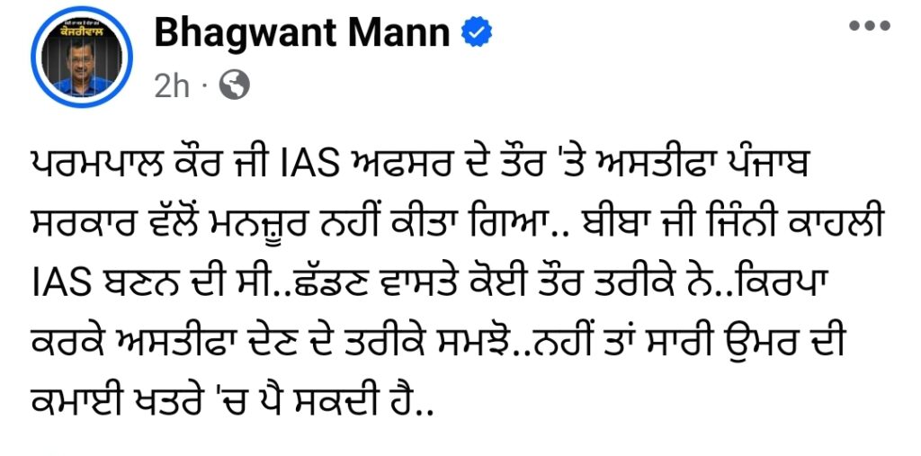 ਪਰਮਪਾਲ ਕੌਰ ਜੀ IAS ਅਫਸਰ ਦੇ ਤੌਰ ‘ਤੇ ਅਸਤੀਫਾ ਪੰਜਾਬ ਸਰਕਾਰ ਵੱਲੋਂ ਮਨਜ਼ੂਰ ਨਹੀਂ ਕੀਤਾ ਗਿਆ.. ਬੀਬਾ ਜੀ ਜਿੰਨੀ ਕਾਹਲੀ IAS ਬਣਨ ਦੀ ਸੀ..ਛੱਡਣ ਵਾਸਤੇ ਕੋਈ ਤੌਰ ਤਰੀਕੇ ਨੇ..ਕਿਰਪਾ ਕਰਕੇ ਅਸਤੀਫਾ ਦੇਣ ਦੇ ਤਰੀਕੇ ਸਮਝੋ..ਨਹੀਂ ਤਾਂ ਸਾਰੀ ਉਮਰ ਦੀ ਕਮਾਈ ਖਤਰੇ ‘ਚ ਪੈ ਸਕਦੀ ਹੈ..