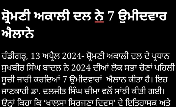 ਚੰਡੀਗੜ੍ਹ, 13 ਅਪ੍ਰੈਲ 2024- ਸ਼੍ਰੋਮਣੀ ਅਕਾਲੀ ਦਲ ਦੇ ਪ੍ਰਧਾਨ ਸੁਖਬੀਰ ਸਿੰਘ ਬਾਦਲ ਨੇ 2024 ਦੀਆਂ ਲੋਕ ਸਭਾ ਚੋਣਾਂ ਪਹਿਲੀ ਸੂਚੀ ਜਾਰੀ ਕਰਦਿਆਂ 7 ਉਮੀਦਵਾਰਾਂ ਐਲਾਨ ਕੀਤਾ ਹੈ। ਇਹ ਜਾਣਕਾਰੀ ਡਾ. ਦਲਜੀਤ ਸਿੰਘ ਚੀਮਾ ਵਲੋਂ ਸਾਂਝੀ ਕੀਤੀ ਗਈ। ਉਨ੍ਹਾਂ ਕਿਹਾ ਕਿ ‘ਖਾਲਸਾ ਸਿਰਜਣਾ ਦਿਵਸ’ ਦੇ ਇਤਿਹਾਸਕ ਅਤੇ ਪਵਿੱਤਰ ਦਿਹਾੜੇ ਨੂੰ ਚੋਣ ਬਿਗਲ ਵਜਾਉਣ ਲਈ ਸਭ ਤੋਂ ਢੁਕਵੇਂ ਦਿਨ ਵਜੋਂ ਚੁਣਦੇ ਹੋਏ ਉਨ੍ਹਾਂ ਨੇ ਪਹਿਲੀ ਸੂਚੀ ਜਾਰੀ ਕੀਤੀ ਹੈ। ਜਿਸ ਵਿਚ ਗੁਰਦਾਸਪੁਰ ਤੋਂ ਡਾਕਟਰ ਦਲਜੀਤ ਸਿੰਘ ਚੀਮਾ, ਸ੍ਰੀ ਆਨੰਦਪੁਰ ਸਾਹਿਬ ਤੋਂ ਪ੍ਰੋ: ਪ੍ਰੇਮ ਸਿੰਘ ਚੰਦੂਮਾਜਰਾ, ਪਟਿਆਲਾ ਤੋਂ ਐਨ ਕੇ ਸ਼ਰਮਾ, ਸ੍ਰੀ ਅੰਮ੍ਰਿਤਸਰ ਸਾਹਿਬ ਤੋਂ ਅਨਿਲ ਜੋਸ਼ੀ, ਸ੍ਰੀ ਫਤਹਿਗੜ੍ਹ ਸਾਹਿਬ ਤੋਂ ਬਿਕਰਮਜੀਤ ਸਿੰਘ ਖਾਲਸਾ, ਫਰੀਦਕੋਟ ਤੋਂ ਐਸ. ਰਾਜਵਿੰਦਰ ਸਿੰਘ (ਸਵਰਗੀ ਐਸ. ਗੁਰਦੇਵ ਸਿੰਘ ਬਾਦਲ ਦਾ ਪੋਤਾ) ਅਤੇ ਸੰਗਰੂਰ ਤੋਂ ਇਕਬਾਲ ਸਿੰਘ ਝੂੰਦਾਂ ਨੂੰ ਚੋਣ ਮੈਦਾਨ ਵਿਚ ਉਤਾਰਿਆ ਗਿਆ ਹੈ।