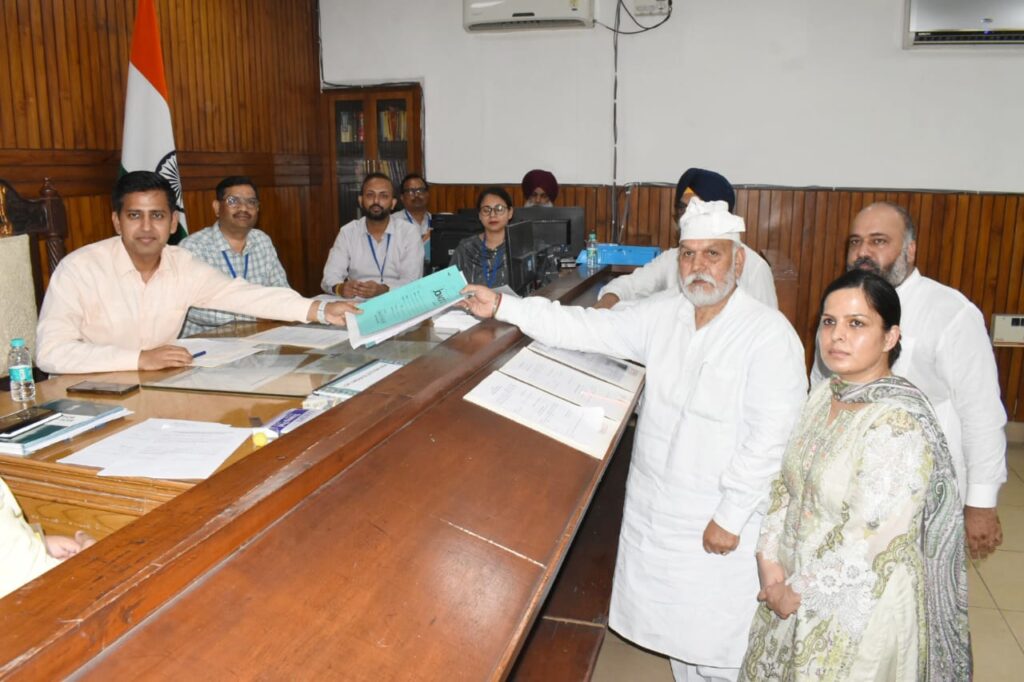 ਰਿਟਰਨਿੰਗ ਅਫ਼ਸਰ ਕਮ ਡਿਪਟੀ ਕਮਿਸ਼ਨਰ ਡਾ ਹਿਮਾਂਸ਼ੂ ਅਗਰਵਾਲ ਜ਼ਿਲ੍ਹਾ ਪ੍ਰਬੰਧਕੀ ਕੰਪਲੈਕਸ ਵਿਖੇ ਸ਼੍ਰੋਮਣੀ ਅਕਾਲੀ ਦਲ ਦੇ ਉਮੀਦਵਾਰ ਮਹਿੰਦਰ ਸਿੰਘ ਕੇ .ਪੀ . ਕੋਲ਼ੋਂ ਨਾਮਜ਼ਦਗੀ ਪੱਤਰ ਪ੍ਰਾਪਤ ਕਰਦੇ ਹੋਏ ।