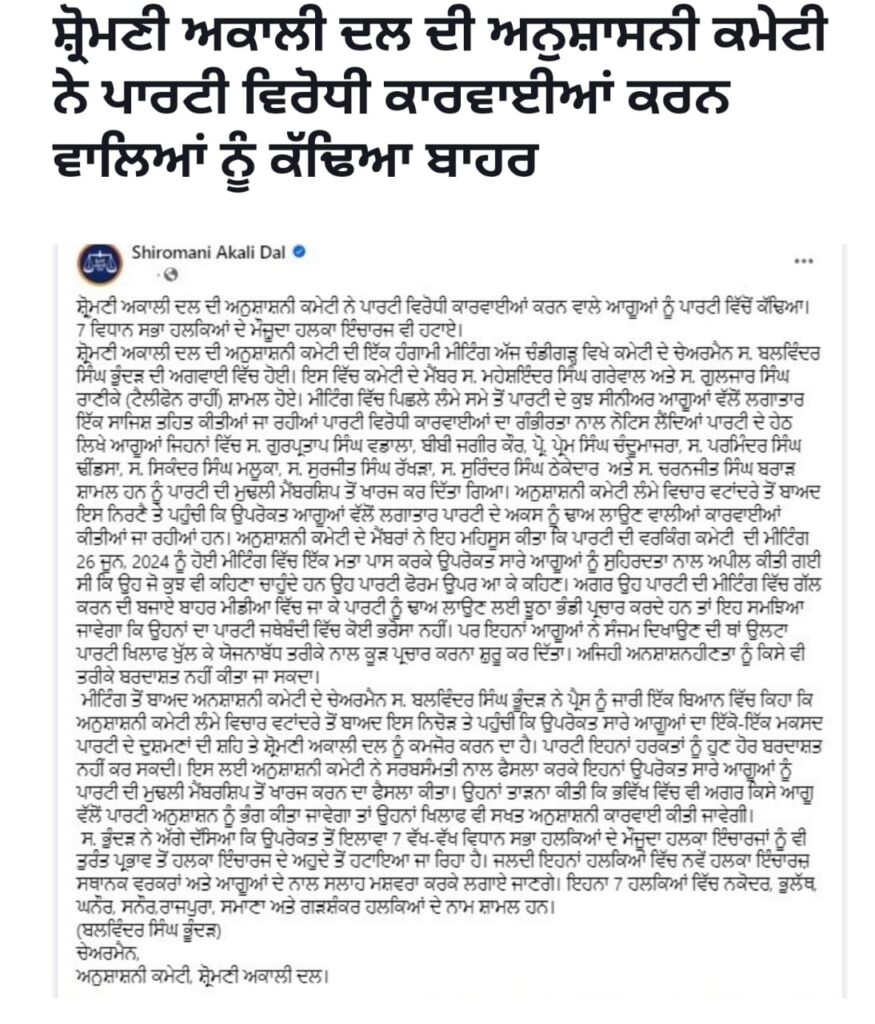ਸ਼ਰੋਮਣੀ ਅਕਾਲੀ ਦਲ ਨੇ ਪਾਰਟੀ ਿਖਲਾਫ ਗਿਤੀਵਧੀਆਂ ਕਰਨ ਵਾਲੇ ਲੀਡਰਾਂ ਨੂੰ ਬਾਹਰ ਦਾ ਰਸਤਾ ਦਿਖਾਇਆ, 7 ਵਿਧਾਨ ਸਭਾ ਹਲਕਿਆਂ ਦੇ ਮੌਜੂਦਾ ਹਲਕਾ ਇੰਚਾਰਜ ਵੀ ਹਟਾਏ। ਸ਼੍ਰੋਮਣੀ ਅਕਾਲੀ ਦਲ ਦੀ ਅਨੁਸ਼ਾਸ਼ਨੀ ਕਮੇਟੀ ਦੀ ਇੱਕ ਹੰਗਾਮੀ ਮੀਟਿੰਗ ਅੱਜ ਚੰਡੀਗੜ੍ਹ ਵਿਖੇ ਕਮੇਟੀ ਦੇ ਚੇਅਰਮੈਨ ਸ. ਬਲਵਿੰਦਰ
