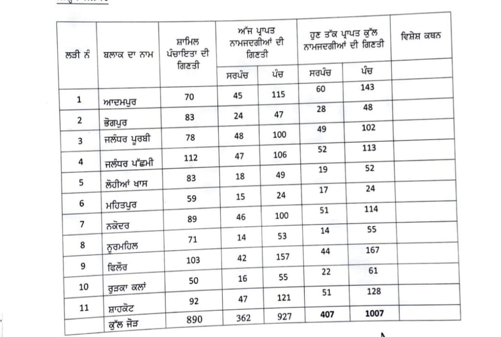 ਜਿਲ੍ਹ ਲੰਧਰ ਦੇ 11 ਬਲਾਕਾਂ ਅਧੀਨ ਸਰਪੰਚਾਂ ਅਤੇ ਪੰਚਾਂ ਦੀਆਂ ਨਾਮਜ਼ਦਗੀਆਂ ਦਾ 2 ਅਕਤੂਬਰ ਤੱਕ ਦਾ ਵੇਰਵਾ- Share this: Click to share on WhatsApp (Opens in new window) WhatsApp Post Click to print (Opens in new window) Print Click to email a link to a friend (Opens in new window) Email Post navigation ਪੰਜਾਬ ਪੁਲਿਸ ਕ੍ਰਾਈਮ ਹੌਟਸਪਾਟਸ ਅਤੇ ਨਸ਼ਾ ਵਿਕਰੀ ਹੌਟਸਪਾਟਸ ’ਤੇ ਵਧਾਏਗੀ ਸੀ.ਸੀ.ਟੀ.ਵੀ. ਨਿਗਰਾਨੀ-ਡੀ ਜੀ ਪੀਚੋਣ ਡਿਊਟੀ ਤੋਂ ਛੋਟ ਦੇਣ ਹਿੱਤ ਬਿਨੈਪੱਤਰਾਂ ਦੇ ਨਿਪਟਾਰੇ ਲਈ ਸੱਤ ਮੈਂਬਰੀ ਕਮੇਟੀ ਦਾ ਗਠਨ
