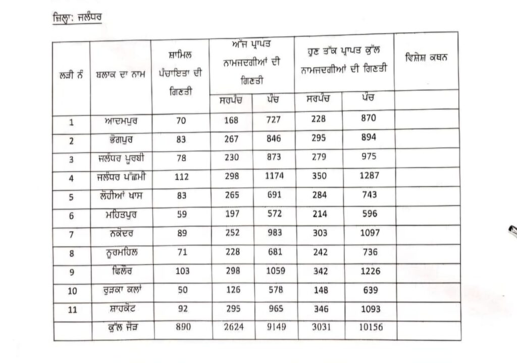 ਜਲੰਧਰ, 15 ਅਕਤੂਬਰ 2024- ਡਿਪਟੀ ਕਮਿਸ਼ਨਰ ਡਾ. ਹਿਮਾਂਸ਼ੂ ਅਗਰਵਾਲ ਨੇ ਅੱਜ ਦੱਸਿਆ ਅਗਾਮੀ ਪੰਚਾਇਤੀ ਚੋਣਾਂ ਲਈ ਜ਼ਿਲ੍ਹਾ ਪ੍ਰਸ਼ਾਸਨ ਨੂੰ ਹੁਣ ਤੱਕ ਕੁੱਲ 13187 ਨਾਮਜ਼ਦਗੀਆਂ ਪ੍ਰਾਪਤ ਹੋਈਆਂ ਹਨ ਜਿਨ੍ਹਾਂ ਵਿੱਚੋਂ 10156 ਨਾਮਜ਼ਦਗੀਆਂ ਸਰਪੰਚਾਂ ਅਤੇ 3031 ਨਾਮਜ਼ਦਗੀਆਂ ਪੰਚਾਂ ਲਈ ਭਰੀਆਂ ਗਈਆਂ ਹਨ।