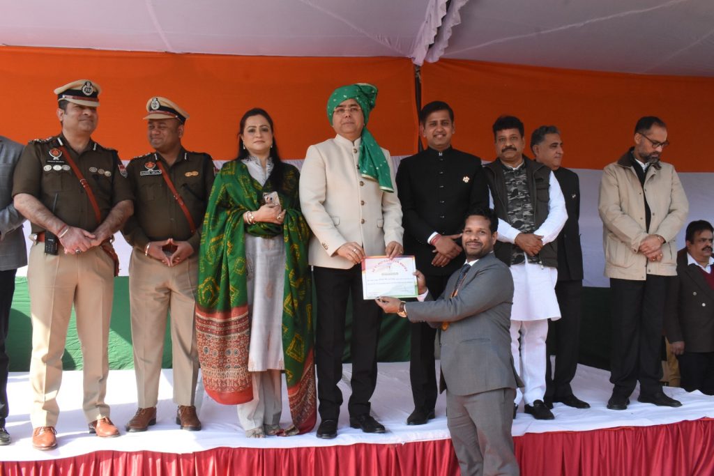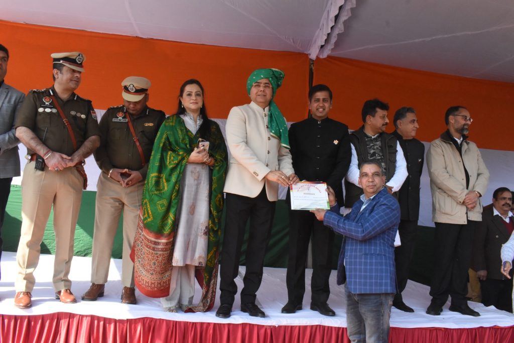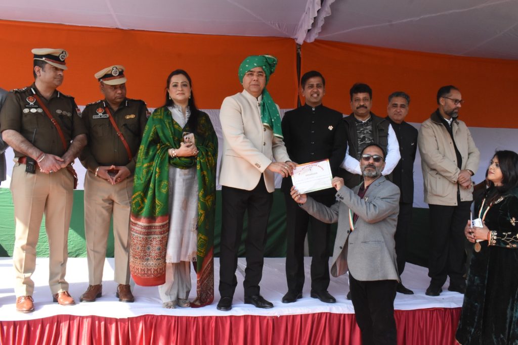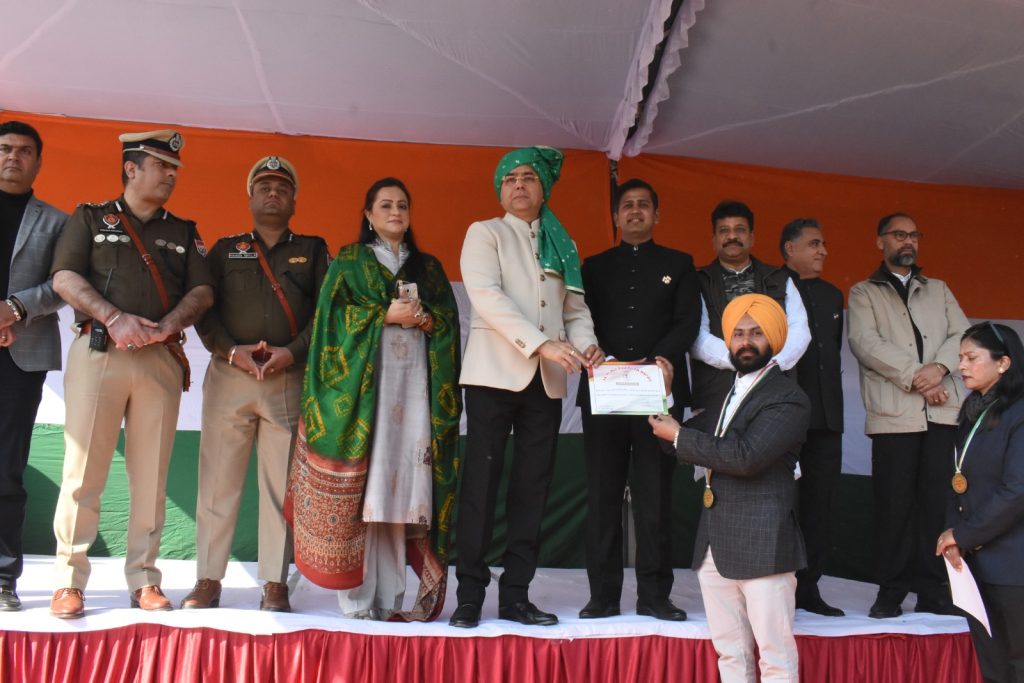 ਜਲੰਧਰ, 27 ਜਨਵਰੀ 2025 :- 76ਵੇਂ ਗਣਤੰਤਰ ਦਿਵਸ ਮੌਕੇ ਸਥਾਨਕ ਗੁਰੂ ਗੋਬਿੰਦ ਸਿੰਘ ਸਟੇਡੀਅਮ ਵਿਖੇ ਕਰਵਾਏ ਗਏ ਜ਼ਿਲ੍ਹਾ ਪੱਧਰੀ ਗਣਤੰਤਰ ਦਿਵਸ ਸਮਾਗਮ ਦੌਰਾਨ ਪੰਜਾਬ ਦੇ ਨਵੀਂ ਤੇ ਨਵਿਆਉਣਯੋਗ ਊਰਜਾ ਸਰੋਤ, ਪ੍ਰਸ਼ਾਸਨਿਕ ਸੁਧਾਰ, ਰੁਜ਼ਗਾਰ ਉਤਪਤੀ, ਹੁਨਰ ਵਿਕਾਸ ਤੇ ਸਿਖ਼ਲਾਈ ਅਤੇ ਪ੍ਰਿੰਟਿੰਗ ਤੇ ਸਟੇਸ਼ਨਰੀ ਮੰਤਰੀ ਅਮਨ ਅਰੋੜਾ ਵਲੋਂ ਵੱਖ-ਵੱਖ ਖੇਤਰਾਂ ਵਿੱਚ ਸ਼ਾਨਦਾਰ ਕਾਰਗੁਜ਼ਾਰੀ ਦਿਖਾਉਣ ਵਾਲੀਆਂ 100 ਸ਼ਖਸੀਅਤਾਂ ਦਾ ਪ੍ਰਸ਼ੰਸਾ ਪੱਤਰਾਂ ਨਾਲ ਸਨਮਾਨ ਕੀਤਾ ਗਿਆ।