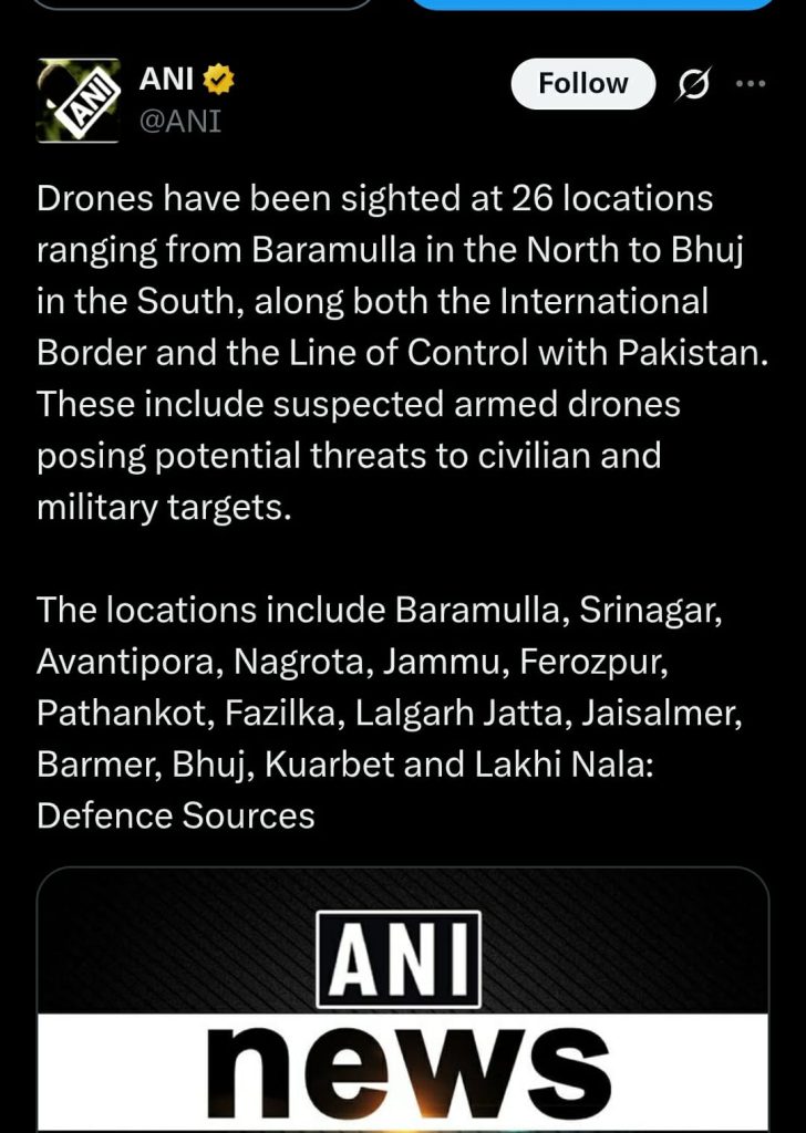 ਨਵੀਂ ਦਿੱਲੀ, 10 ਮਈ 2025- ਪਾਕਿਸਤਾਨ ਵੱਲੋਂ ਜੈਸਲਮੇਰ ਤੋਂ ਅੰਮ੍ਰਿਤਸਰ, ਬਾਰਾਮੂਲਾ ਤੋਂ ਭੁਜ ਤੱਕ 26 ਥਾਵਾਂ ਤੇ ਡਰੋਨ ਹਮਲੇ ਕੀਤੇ ਗਏ ਭਾਰਤ ਨੇ ਜੈਸਲਮੇਰ ਵਿੱਚ 9 ਅਤੇ ਅੰਮ੍ਰਿਤਸਰ ਵਿੱਚ ਲਗਭਗ 15 ਪਾਕਿਸਤਾਨੀ ਡਰੋਨ ਸੁੱਟ ਲਏ ਜੰਮੂ। ਕਸ਼ਮੀਰ ਤੋਂ ਲੈ ਕੇ ਪੰਜਾਬ ਗੁਜਰਾਤ, ਹਰਿਆਣਾ, ਰਾਜਸਥਾਨ ਤੱਕ ਡਰੋਨ ਹਮਲਿਆਂ ਦੇ ਮੱਦੇ ਨਜ਼ਰ ਸਖਤ ਜਵਾਬੀ ਕਾਰਵਾਈ ਕੀਤੀ ਗਈ।