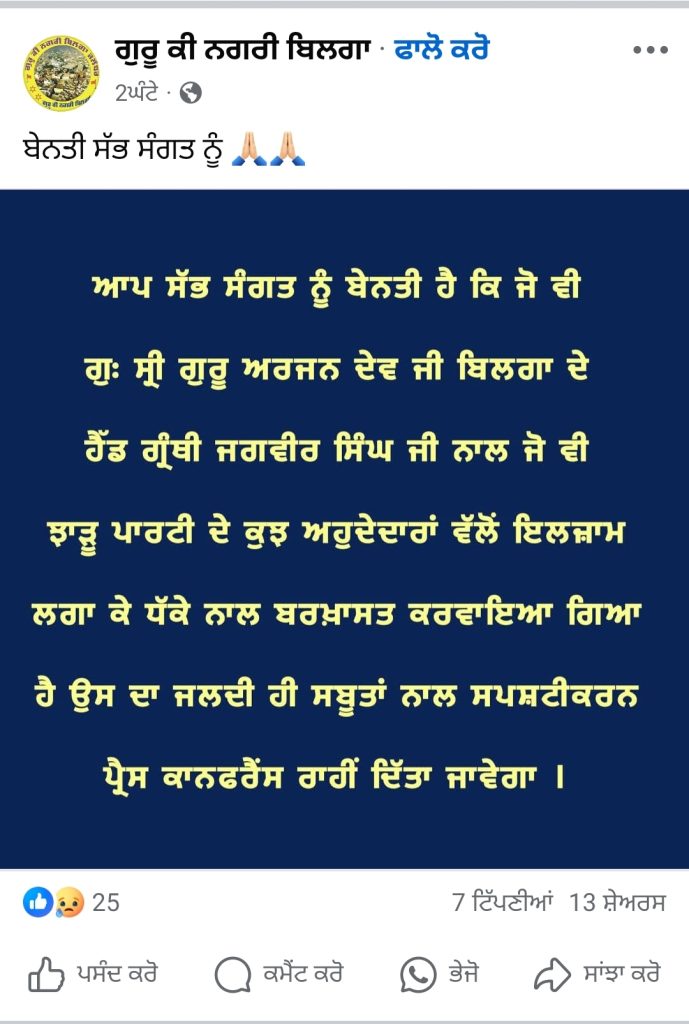 ਹੁਣ ਫੇਸਬੁੱਕ ਤੇ ਪੋਸਟ ਵਾਇਰਲ ਹੋਈ ਹੈ ਜਿਸ ਨੂੰ ਲੈ ਕੇ ਇਹ ਸਥਿਤੀ ਸਪੱਸ਼ਟ ਕਰਨ ਲਈ ਖਬਰ ਲਾਉਣ ਦੀ ਲੋੜ ਬਣੀ ਜਦੋ ਕਿ ਦੋਵੇਂ ਧਿਰਾਂ ਮੀਡੀਏ ਸਾਹਮਣੇ ਆਉਣ ਲਈ ਤਿਆਰ ਨਹੀ ਜਦੋਂ ਕਿ ਜਗਵੀਰ ਸਿੰਘ ਨਾਲ ਕਿਸੇ ਪੱਤਰਕਾਰ ਨੇ ਸੰਪਰਕ ਸਾਧਿਆ ਸੀ ਕਿ ਤੁਹਾਡੇ ਤੇ ਇਹ ਦੋਸ਼ ਹੈ ਪਰ ਉਹਨਾਂ ਵੱਲੋ ਪੱਖ ਦੇਣ ਲਈ ਤਸੱਲੀ ਬਖਸ਼ ਜਵਾਬ ਨਹੀ ਆਇਆ।