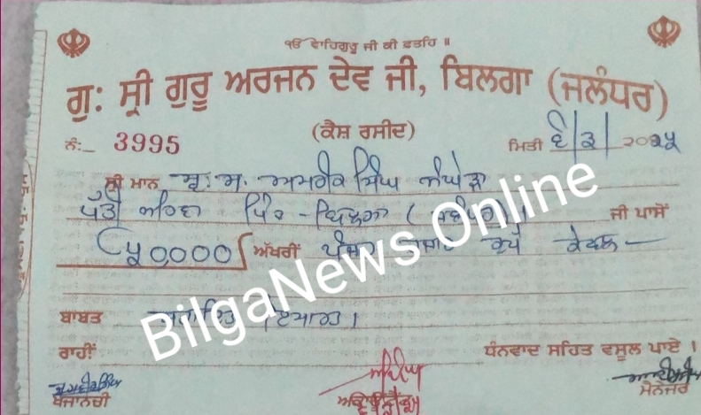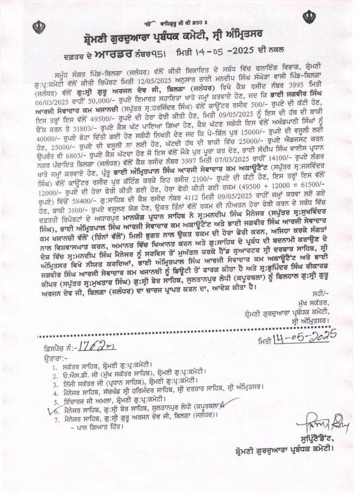 ਇਤਿਹਾਸਿਕ ਸ੍ਰੀ ਗੁਰੂ ਅਰਜਨ ਦੇਵ ਜੀ ਬਿਲਗਾ ਵਿਖੇ ਜੋ ਐਸ. ਜੀ. ਪੀ. ਸੀ ਅੰਮ੍ਰਿਤਸਰ ਦੇ ਦਫਤਰ ਦੇ ਆਰਡਰ ਨੰਬਰ 951 ਮਿਤੀ 14-05-2025 ਦੀ ਨਕਲ ਅਨੁਸਾਰ ਚੜ੍ਹਤ ਦੌਰਾਨ ਹੇਰਾਫੇਰੀ ਕੀਤੇ ਜਾਣ ਦੀ ਪੜਤਾਲ ਸਾਹਮਣੇ ਲਿਆਂਦੀ ਹੈ। ਮਿਤੀ 6 ਮਾਰਚ 2025 ਨੂੰ ਪੰਜਾਹ ਹਜ਼ਾਰ ਰੁਪਏ ਮਾਇਆ ਅਮਰੀਕ ਸਿੰਘ ਸੰਘੇੜਾ ਦੇ ਨਾਂ ਤੇ ਰਸੀਦ ਨੰਬਰ 3995 ਹੈ ਜੋ ਪਰਿਵਾਰ ਵਿਦੇਸ਼ ਵਿਚ ਹੈ। ਹੇਠ ਲਿਖੇ ਆਰਡਰ ਨੂੰ ਪੜਿਆ ਜਾਵੇ ਪੂਰਾ ਮਾਮਲਾ ਸਮਝਣ ਲਈ-