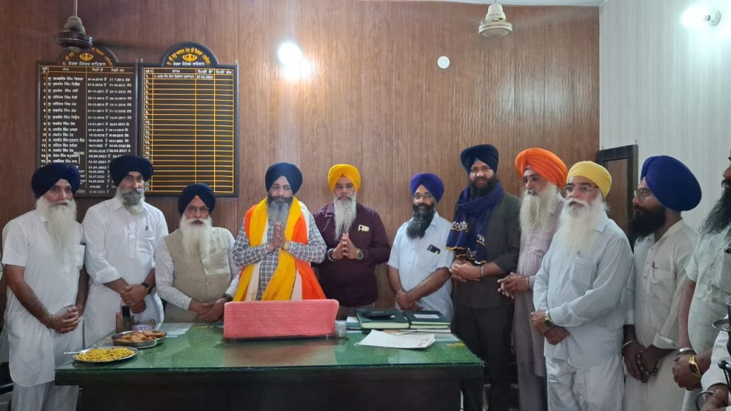 ਨਵੇਂ ਮੈਨੇਜਰ ਨੂੰ ਸਿਰੋਪਾਓ ਦੇਣ ਸਮੇਂ ਜਥੇਦਾਰ ਬਲਦੇਵ ਸਿੰਘ ਕਲਿਆਣ ਅਤੇ ਹੋਰ।