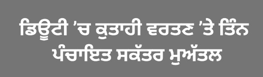 ਡਿਪਟੀ ਕਮਿਸ਼ਨਰ ਨੇ ਜਾਣਕਾਰੀ ਦਿੰਦਿਆਂ ਦੱਸਿਆ ਕਿ ਪੇਂਡੂ ਵਿਕਾਸ ਅਤੇ ਪੰਚਾਇਤ ਵਿਭਾਗ ਵੱਲੋਂ ਪ੍ਰਾਪਤ ਹੁਕਮਾਂ ਅਨੁਸਾਰ ਪੰਚਾਇਤ ਸਕੱਤਰ ਪ੍ਰਸ਼ੋਤਮ ਲਾਲ ਤੇ ਦਿਲਬਾਗ ਸਹੋਤਾ (ਪੰਚਾਇਤ ਸੰਮਤੀ ਜਲੰਧਰ ਪੱਛਮੀ) ਅਤੇ ਪਰਵਿੰਦਰ ਸਿੰਘ ਪੰਚਾਇਤ ਸਕੱਤਰ, ਪੰਚਾਇਤ ਸੰਮਤੀ ਫਿਲੌਰ ਨੂੰ ਅਹੁਦੇ ਤੋਂ ਮੁਅੱਤਲ ਕੀਤਾ ਗਿਆ ਹੈ। ਉਨ੍ਹਾਂ ਦੱਸਿਆ ਕਿ ਮੁਅੱਤਲੀ ਦੌਰਾਨ ਇਨ੍ਹਾਂ ਦਾ ਹੈੱਡਕੁਆਰਟਰ ਦਫ਼ਤਰ ਜ਼ਿਲ੍ਹਾ ਵਿਕਾਸ ਅਤੇ ਪੰਚਾਇਤ ਅਫ਼ਸਰ, ਜਲੰਧਰ ਹੋਵੇਗਾ।