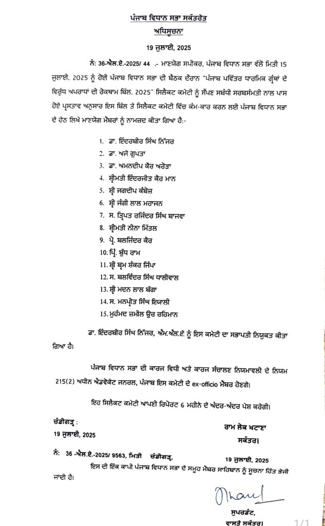 ਪੰਜਾਬ ਪਵਿੱਤਰ ਧਾਰਮਿਕ ਗ੍ਰੰਥਾਂ ਦੇ ਵਿਰੁੱਧ ਅਪਰਾਧਾਂ ਦੀ ਰੋਕਥਾਮ ਬਿੱਲ 2025 ਸਿਲੈਕਟ ਕਮੇਟੀ ਨੂੰ ਸੌਪਣ ਸੰਬੰਧੀ ਸਰਬਸੰਮਤੀ ਨਾਲ ਪਾਸ ਹੋਏ ਪ੍ਰਸਤਾਵ ਅਨੁਸਾਰ ਇਸ ਬਿੱਲ ਤੇ ਸਿਲੈਕਟ ਕਮੇਟੀ ਵਿੱਚ ਕੰਮਕਾਰ ਕਰਨ ਲਈ ਪੰਜਾਬ ਵਿਧਾਨ ਸਭਾ ਦੇ ਹੇਠ ਲਿਖੇ ਮਾਣਯੋਗ ਮੈਂਬਰਾਂ ਨੂੰ ਨਾਮਜ਼ਦ ਕਰਨ ਕੀਤਾ ਗਿਆ ਹੈ :-
