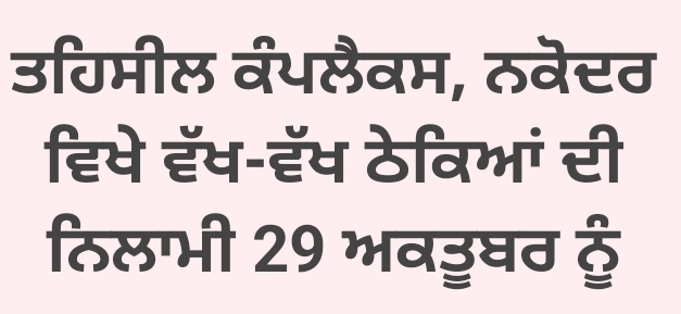 ਜਲੰਧਰ, 26 ਅਕਤੂਬਰ 2025 :- ਤਹਿਸੀਲ ਕੰਪਲੈਕਸ, ਨਕੋਦਰ ਵਿਖੇ ਸਾਲ 2025-26 ਦੇ ਵੱਖ-ਵੱਖ ਠੇਕਿਆਂ ਦੀ ਨਿਲਾਮੀ (ਸਮਾਂ 1-11-2025 ਤੋਂ 31-3-2026 ਤੱਕ) 29 ਅਕਤੂਬਰ 2025 ਨੂੰ ਹੋਵੇਗੀ।